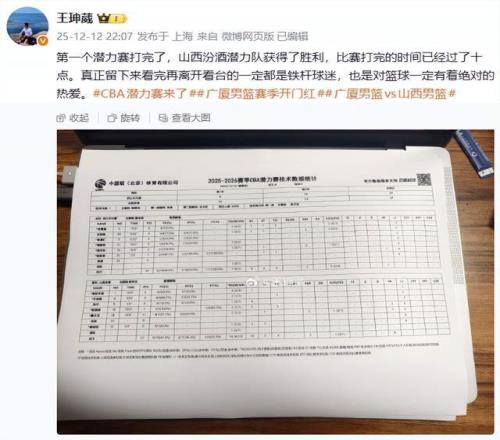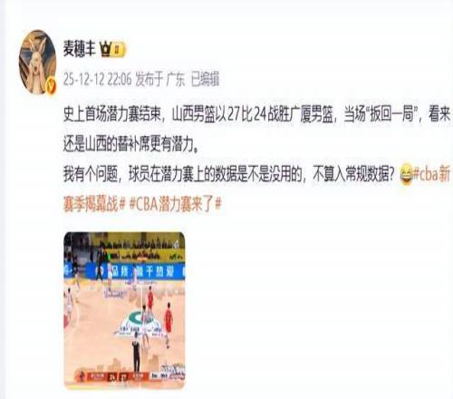 麦穗丰:“史上首场潜力赛结束,山西男篮以27比24战胜广厦男篮,当场“扳回一局”,看来还是山西的替补席更有潜力。我有个问题,球员在潜力赛上的数据是不是没用的,不算入常规数据?。”