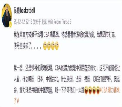 吴頔:“还是领导们高瞻远瞩,CBA的潜力就是中国男篮的潜力,这可不能随便让人看,什么韩国,日本,什么美国,法国,德国,以后打世界杯,奥运会,潜力球员井喷的中国男篮,能一下子吓他们一大跳。”