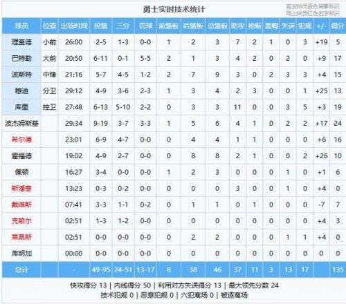 波杰姆斯基24分6板4助、库里19分3板11助、巴特勒17分3板4助2断、希尔德16分4板2助、波斯特15分9板3助2帽、穆迪13分4板2助3断、霍福德10分8板2助、戴维斯7分1板