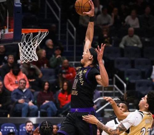 节末东契奇和卡林顿对轰三分,半场结束时,湖人77-48领先奇才,东契奇半场就拿到26分11篮板11助攻的三双数据。东契奇也以18分4秒拿到三双的成绩,刷新湖人队史最快纪录!进入下半场,老詹继续助攻艾顿扣篮,拉拉维亚补篮,詹姆斯随后上演一记空接背扣,又将奇才打停。奇才溃不成军,东契奇又连续跳投命中!中段老詹一打二强行造犯规后,东契奇继续扔三分,艾顿吃饼,湖人最多领先奇才38分!后半段双方维持35分左右陷入拉锯战,奇才在节末打出一波小高潮,三节战罢,湖人108-84。