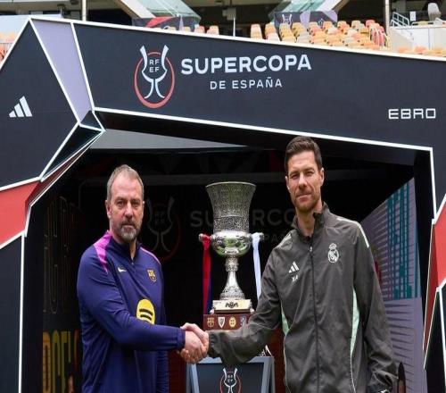 2026年西班牙超级杯决赛前,作为传统环节之一,巴塞罗那主帅弗里克和皇家马德里主帅哈维-阿隆索在奖杯前合影。北京时间1月12日凌晨3:00,巴塞罗那和皇家马德里将在沙特阿拉伯吉达